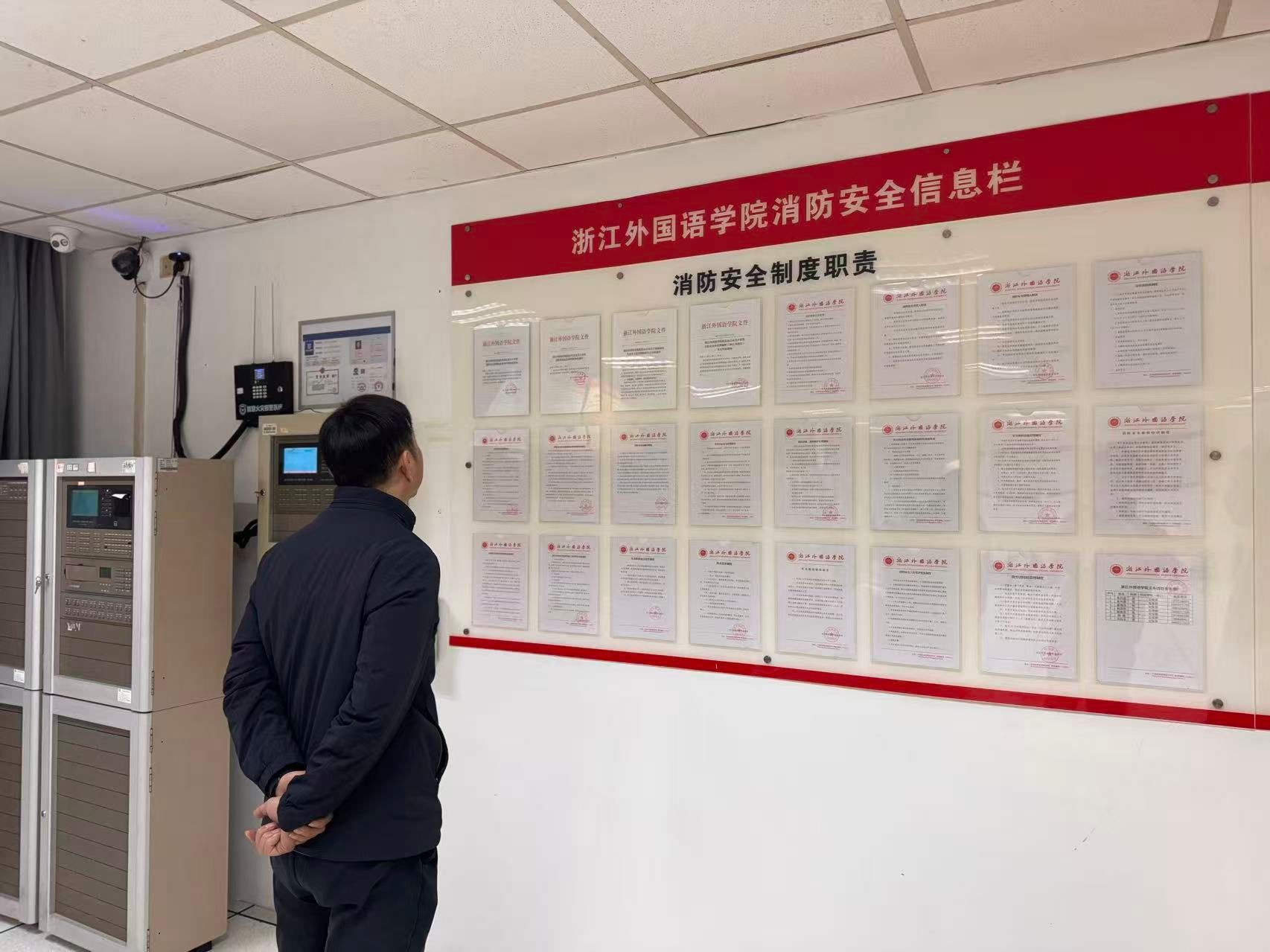 随后,前往水泵房和各消控室,现场查阅了消防安全管理制度、应急处置流程规范等资料,详细询问了分区域巡逻机制与快速响应预案落实情况。在各校门门岗查看防暴器材柜的配备与维护状况,要求定期检查器材性能,确保应急状态下器材能够正常使用。