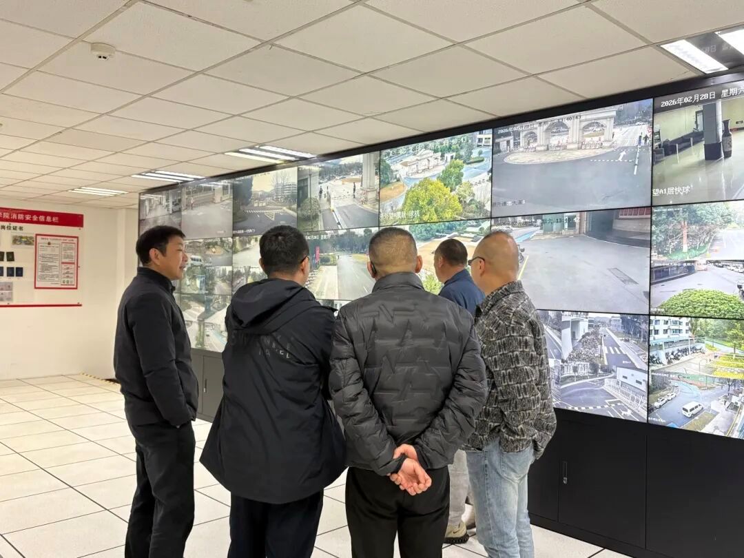 在监控室、校门岗,详细了解人员到岗、值班值守、出入登记等情况,查看监控及人脸识别系统运行状态,要求值班人员严守岗位、履职尽责,严把校园出入安全关。在消控室,现场检查消防控制系统、消防器材及值班值守情况,强调要严格落实 24 小时值班制度,规范记录、加强巡检、及时维护,坚决守住消防安全底线。
