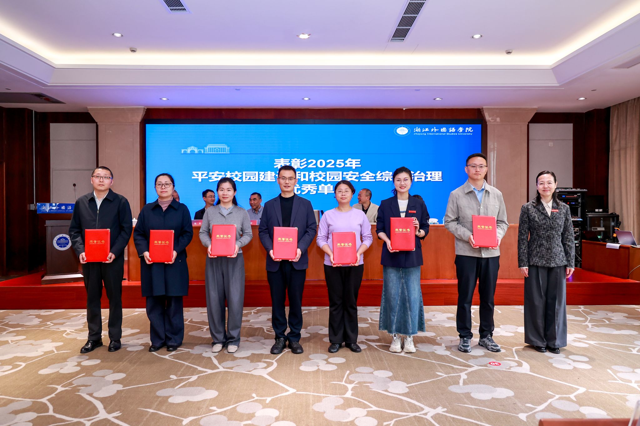 会上,杭州市公安局警官王强应邀做安全稳定工作辅导报告,为校园风险防范提供专业指导。党委宣传部、安保部分别就意识形态安全、平安校园建设作专项报告,学工部、学生处,西语学院,后勤中心作交流发言。会议对2025年度平安校园建设及安全综合治理优秀单位予以表彰,现场签订意识形态工作责任书、等级平安校园目标管理责任书,压实安全工作责任。